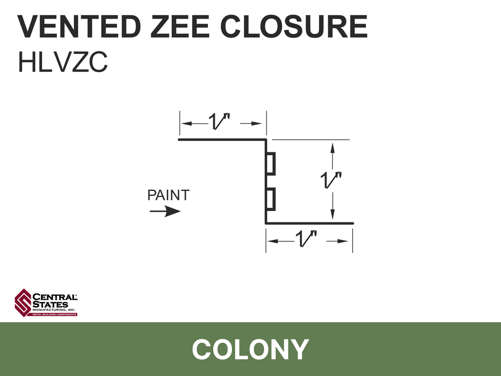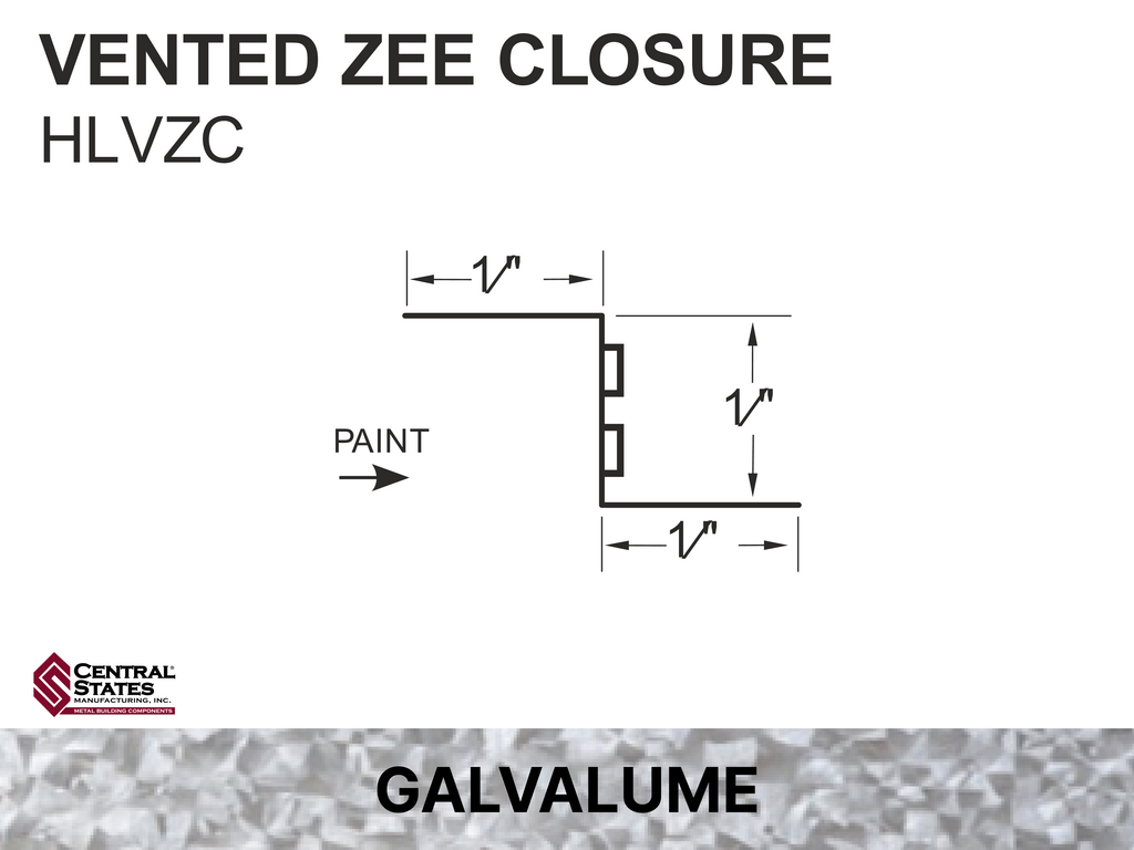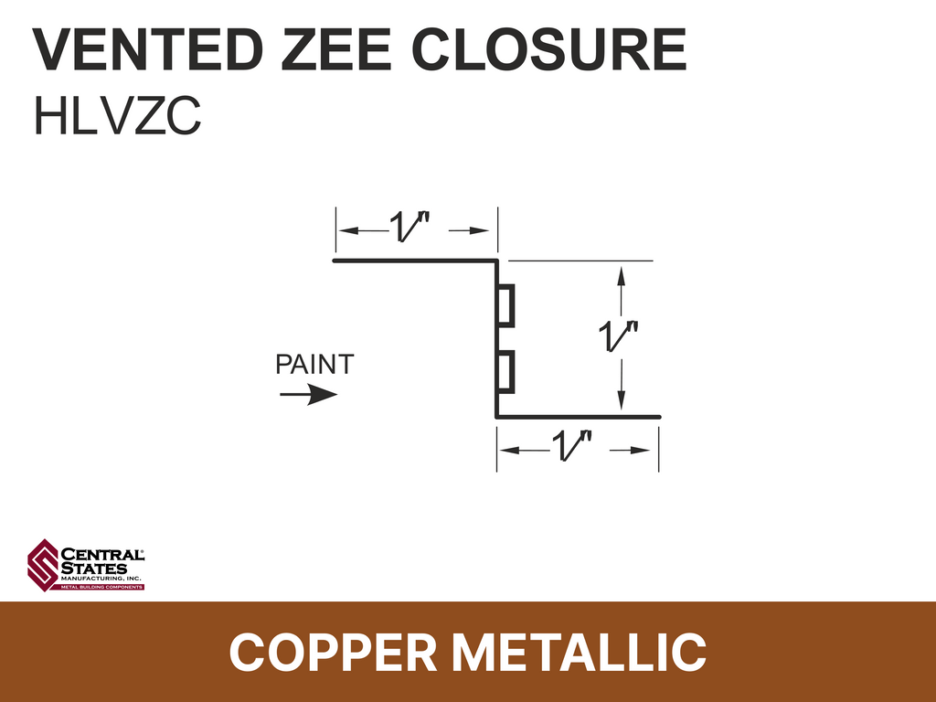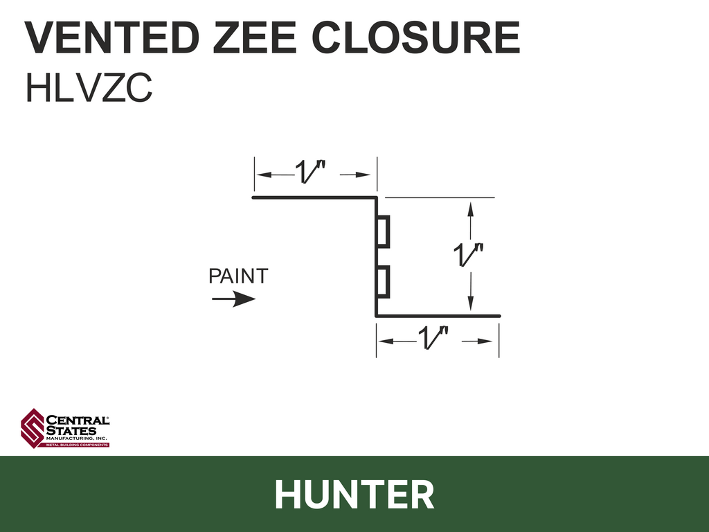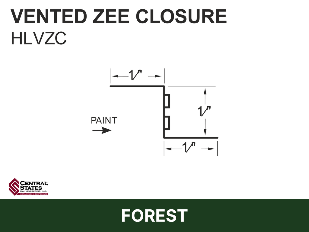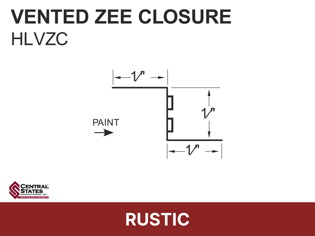 The H-Loc™ Vented Zee Closure is a profile-matched metal closure that provides both panel support and continuous airflow at the ridge of exposed-fastener metal roof systems. Designed for Central States H-Loc™ panel profiles, it creates a secure fastening surface while allowing warm, moist air to escape — helping reduce condensation and improve roof system longevity.